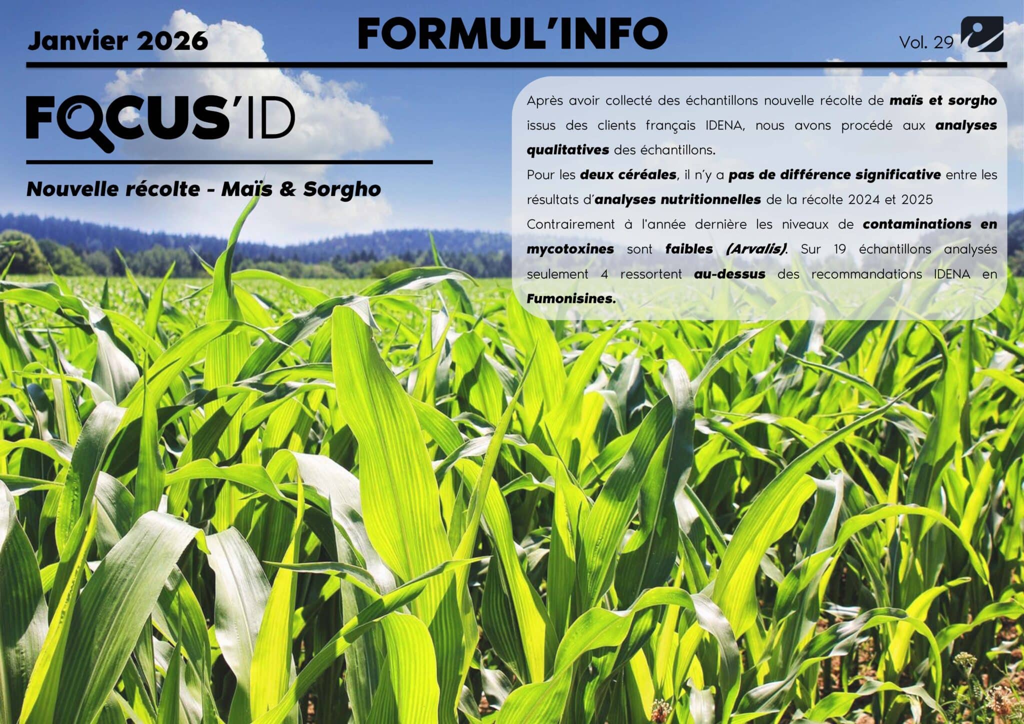 Pour les deux céréales, il n’y a pas de différence significative entre les résultats d’analyses nutritionnelles de la récolte 2024 et 2025. Contrairement à l’année dernière les niveaux de contaminations en mycotoxines sont faibles (Arvalis). Sur 19 échantillons analysés seulement 4 ressortent au-dessus des recommandations IDENA en Fumonisines.